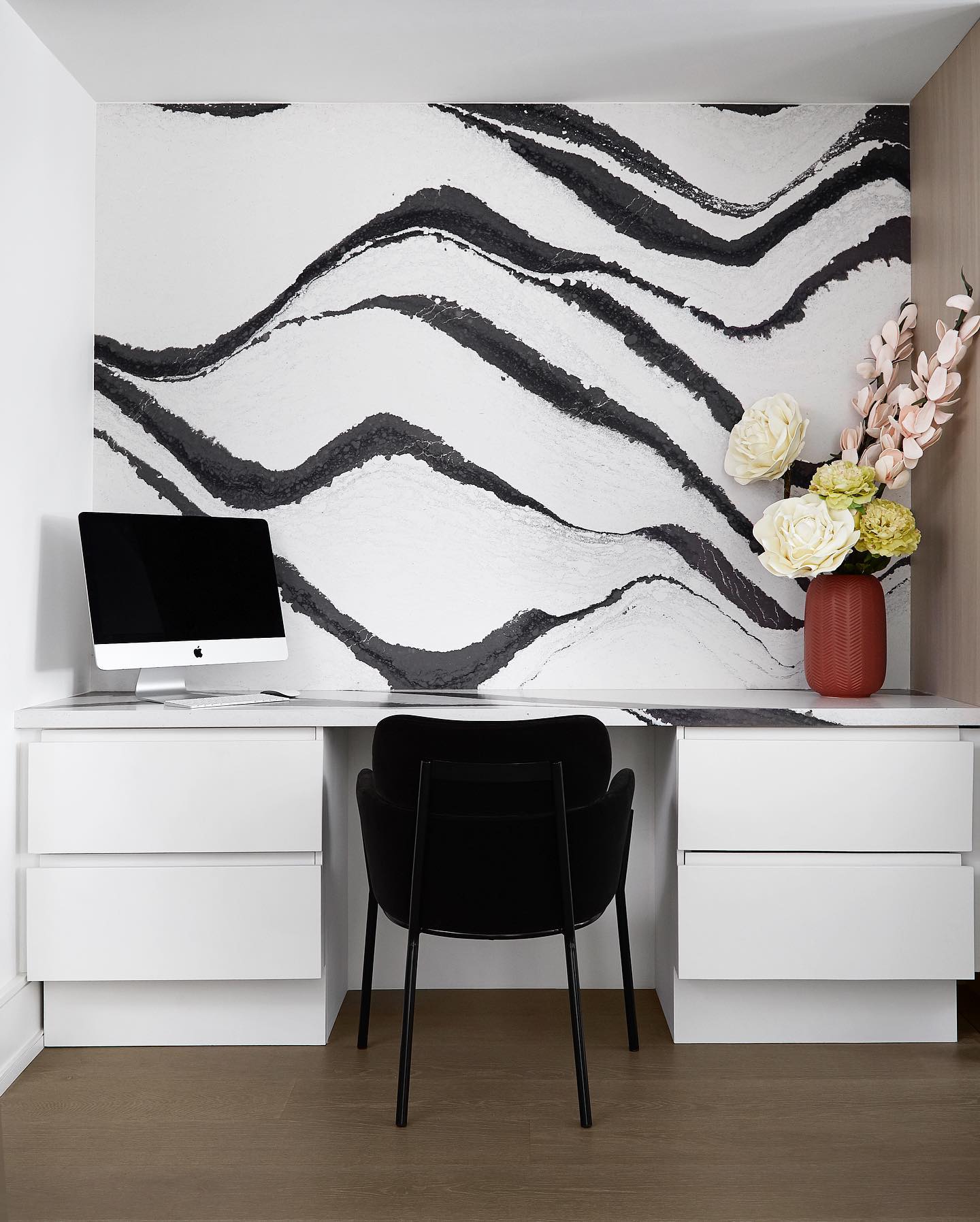 Our client hired our firm to dress up their newly purchased home with new furnishings, lighting fixtures, wall paneling, custom furniture, and accent pieces with pops of colour.